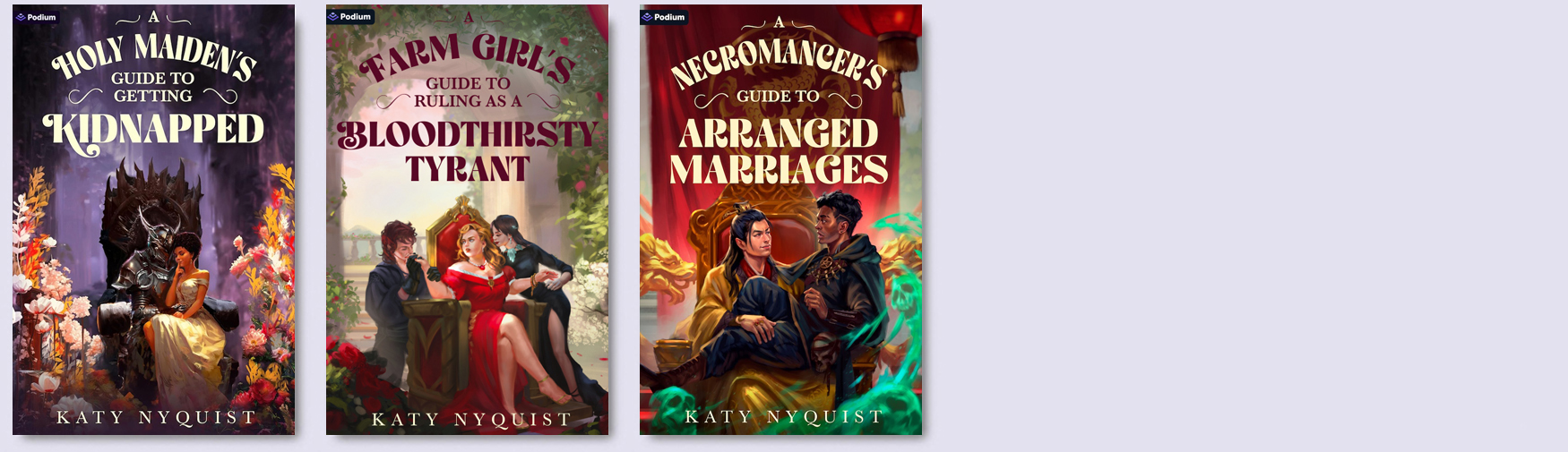 Katy’s debut novel is A HOLY MAIDEN’S GUIDE TO GETTING KIDNAPPED, was published in 2025 by Podium. The first in the Scandals of the Gifted series, it was followed by A FARM GIRL’S GUIDE TO RULING AS A BLOODTHIRSTY TYRANT and A NECROMANCER’S GUIDE TO ARRANGED MARRIAGES (both in 2026).